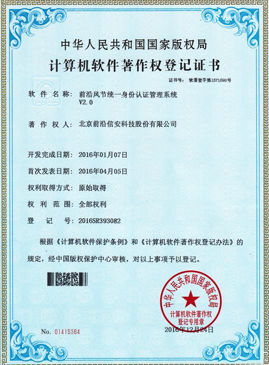 软件著作权证书--前沿风节统一身份认证管理系统V2.0