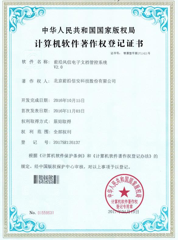 软件著作权证书--前沿风信电子文档管控系统V2.0