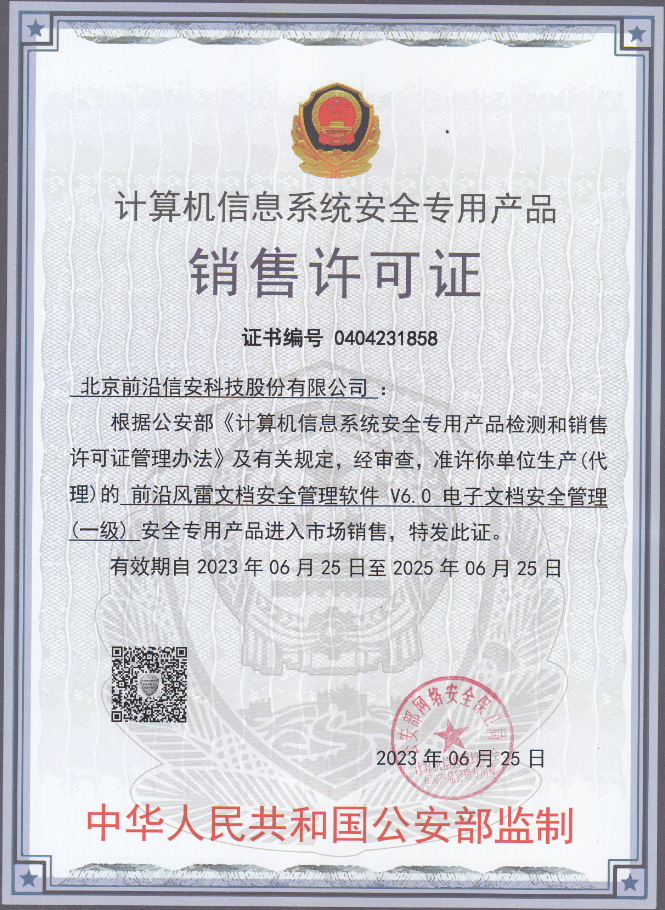计算机信息系统安全专用产品销售许可证--前沿风雷V6.0